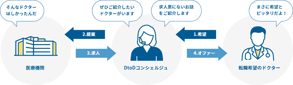 総合メディカルは医療機関との密なコミュニケーションにより、医療機関が持つ潜在的な求人ニーズをリアルタイムで把握しています。この密なパイプを活用し、DtoDコンシェルジュでは、医師からの条件を基に「新たな求人」を医療機関に提案することができます。そのため、ドクターの希望に合った転職を実現することができます。