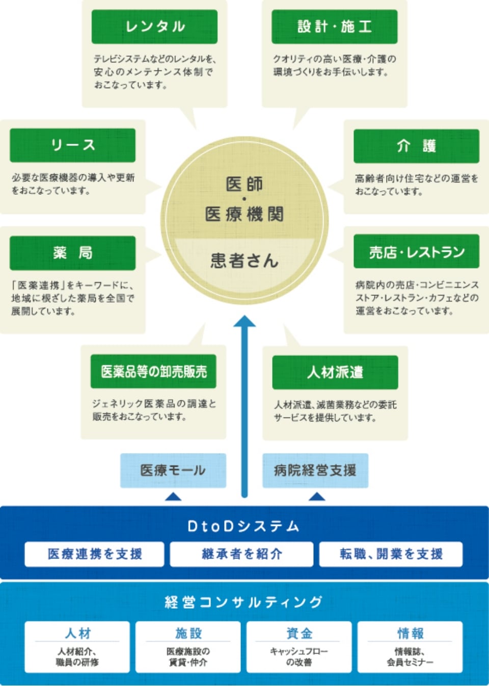 総合メディカル株式会社はコンサルティングをベースに医業経営のトータルサポートで8,000件以上の医療機関と情報ネットワークを構築してきました。医療機関との関係は、一般の転職支援企業と異なり、医師紹介だけでは終わりません。